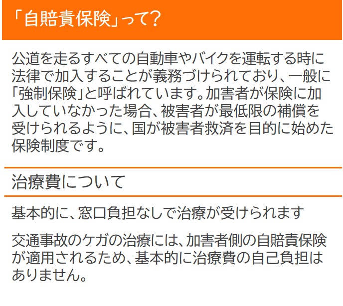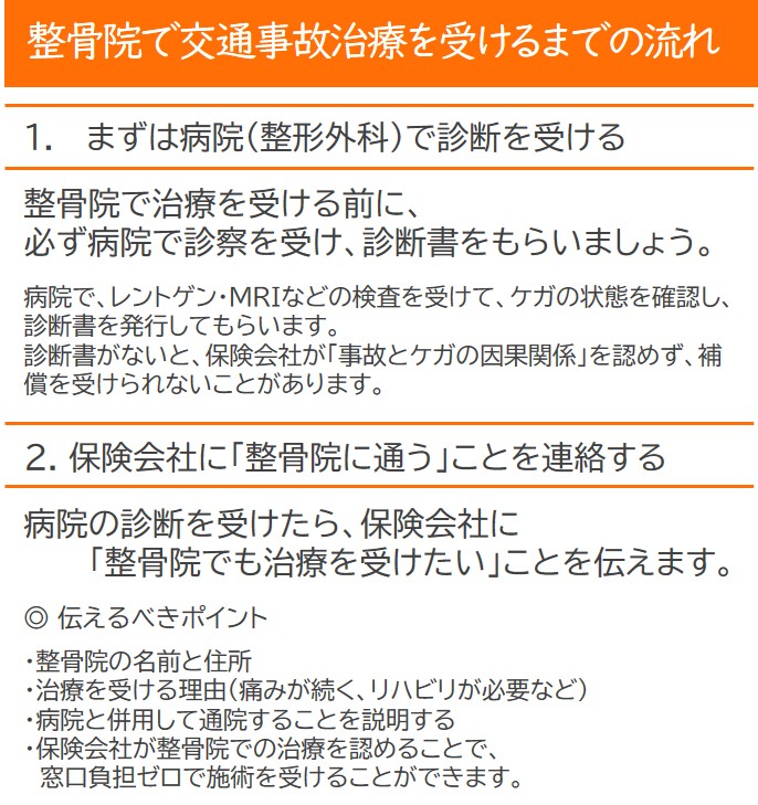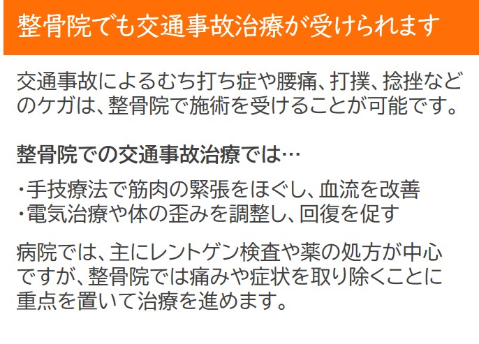 交通事故によるケガは、整骨院でも治療を受けることが可能で、自賠責保険を利用すれば窓口負担ゼロで通院できます。
