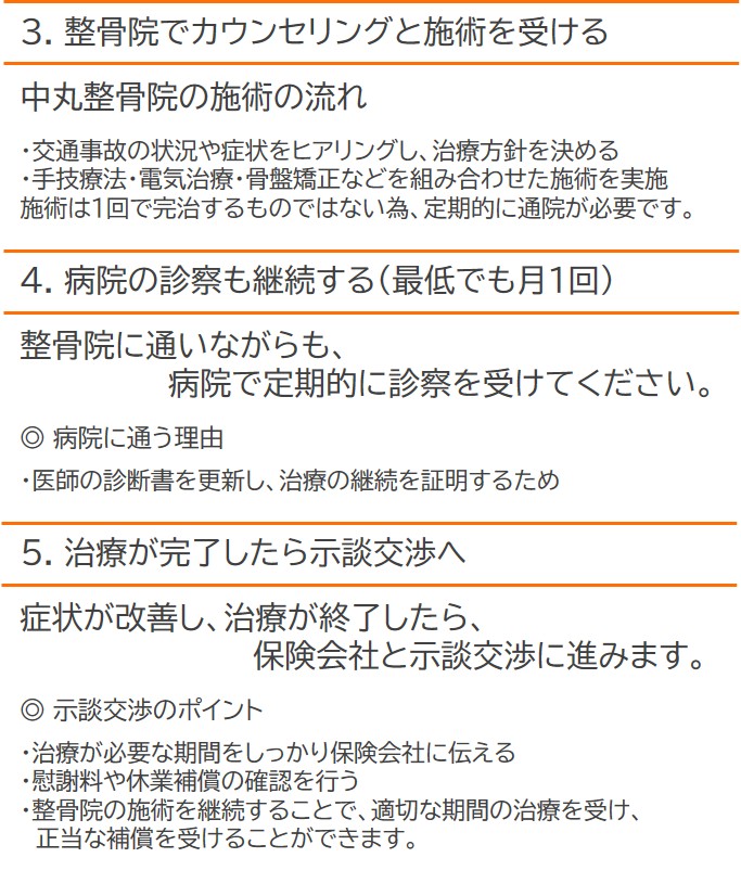 ケガの治療はもちろん、保険会社との対応もサポートいたします。
